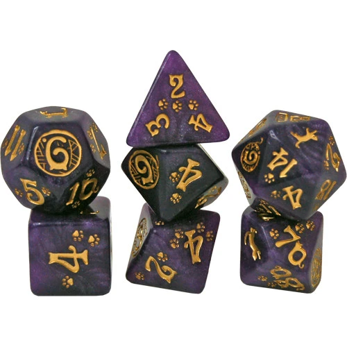 This dice set consists of 7 polyhedrons with digits kept in a feline font style, and you will find no less than 3 variations of their faces! Some show cat’s paws trails, others have a ball of yarn, and the highest ones depict cats in person, just doing their feline things!