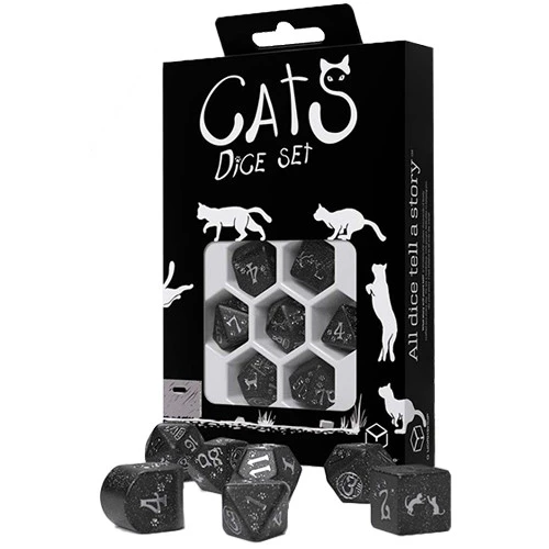 This dice set consists of 7 polyhedrons with digits kept in a feline font style, and you will find no less than 3 variations of their faces! Some show cat’s paws trails, others have a ball of yarn, and the highest ones depict cats in person, just doing their feline things!