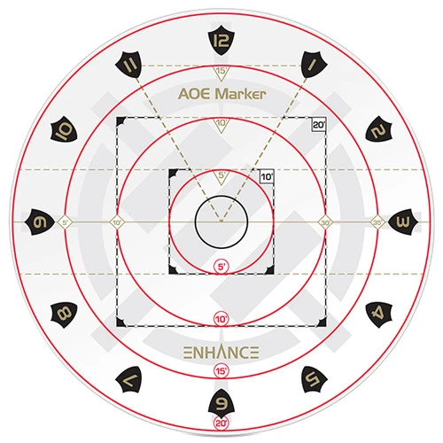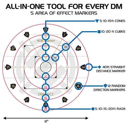 Features a straight line indicator with distance markers (up to 40ft) which allows the AoE marker to be used to determine distances for gamers who do not use a battle map. Markers and labels are clearly indicated and easy to read. This marker has an 8″ diameter.