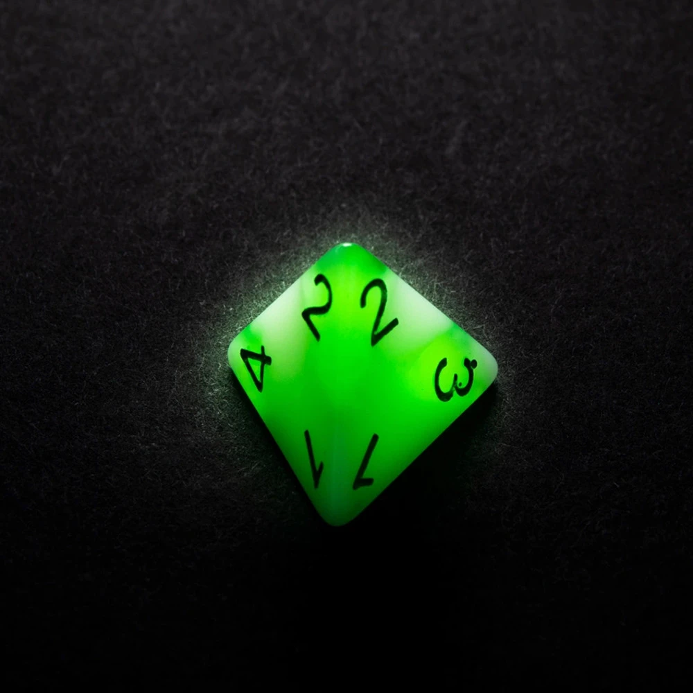 Choose your weapon! This dice set contains a D4, a D6, a D8, two D10 (10 and 00), a D12 and a D20. All dice are round-cornered and manufactured at a premium level. The dice from the Glow dice set glow in the dark and won’t let the light go out on your adventure.