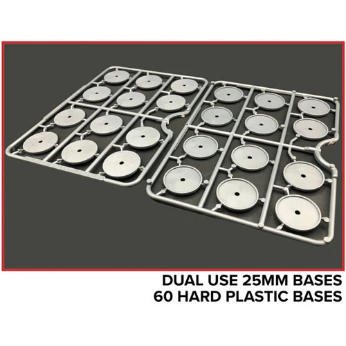 These are a new kind of 25mm round base that has been designed to work with figures that have either an integral “puddle” base or flat feet. One side has a 23mm x 1mm indented recess so that figures with puddle bases will have their feet flush with the edge and eliminate that “standing on a hill” look. The other side is flat for figures which will have their feet glued directly to the base.