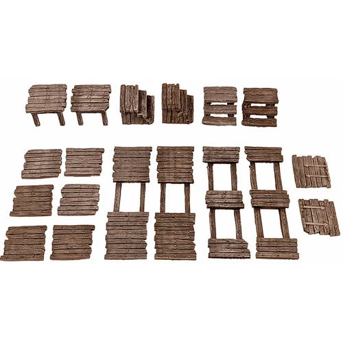 The Bridges & Barricades set includes four footbridges, two small platforms, four sets of steps, and two door panels. Construct a long bridge, group the pieces together to build a large platform, or set the pieces on their sides to serve as obstacles. Our bridges have panel sections that lift off to act as gaps or trap doors. These panels are useful as accent terrain on your battlefield.