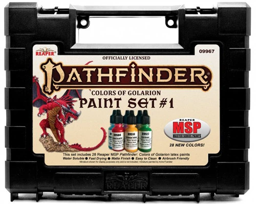 This paint set includes 28 half-ounce (.5 oz) bottles of Officially Licensed Pathfinder: Colors of Golarion latex paints, specifically designed for miniatures painting. These paints are water-soluble, fast drying, easy to clean, airbrush friendly, and have a matte finish. Pathfinder Paints are ideal for metal, resin, or plastic miniatures!