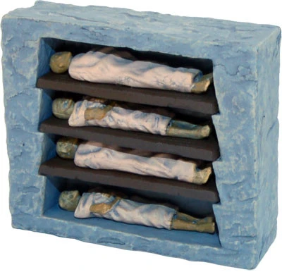 This product consists of a Cypt Wall with three removable shelves and four removable corpses.