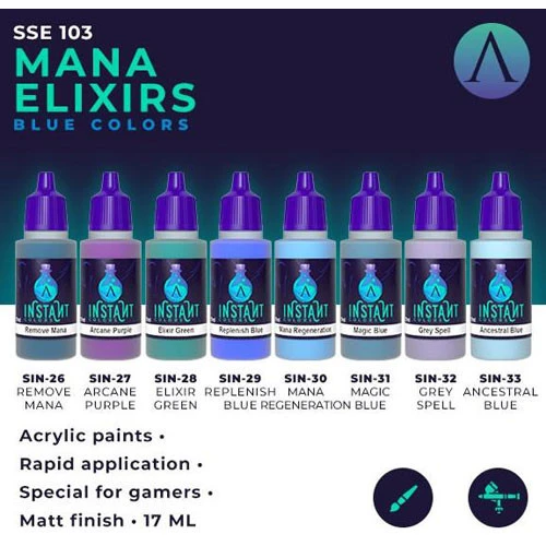 Use Mana Elixirs to paint cold colors, ice & water, silver NMM (Non Metallic Metal), armors, weapons, chain mail, buckles, sea & celestial creatures, etc.
