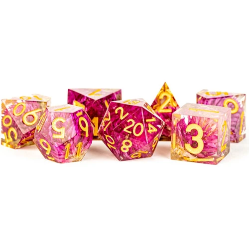 MDG sharp edge resin dice are handcrafted with beautiful inclusions. Unlike mass produced dice, MDG sharp edge dice are hand polished for precision rolls. Each full-sized set comes in a protective tin case and includes 7 dice (d4, d6, d8, d10, d10%, d12, and d20).