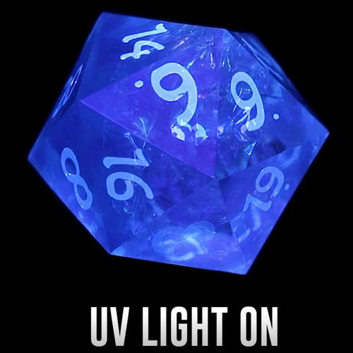 Give your players a new way to add excitement and intrigue to the table. Numbers appear in the blink of an eye under the black light. Each set comes with black light stylus. Stunning, sharp edge resin dice. Precision in every roll. Eye catching foils shine through in natural and black light. Roll the die for a suspenseful reveal! Did the BBEG fail the save or is the party in trouble? Blind challenges or gambles. No one will know who won until the light reveals the numbers!