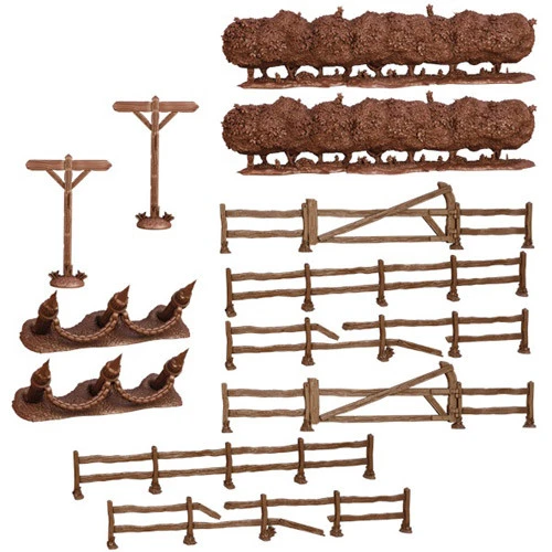 Many fantasy battles are fought over abandoned farmsteads and hastily erected defences. This set includes fences, hedges, archers’ stakes, and signposts. These are perfect as obstacles for Kings of War or any other fantasy battle game.