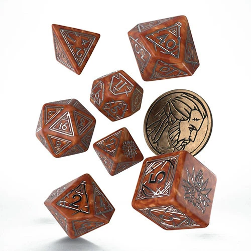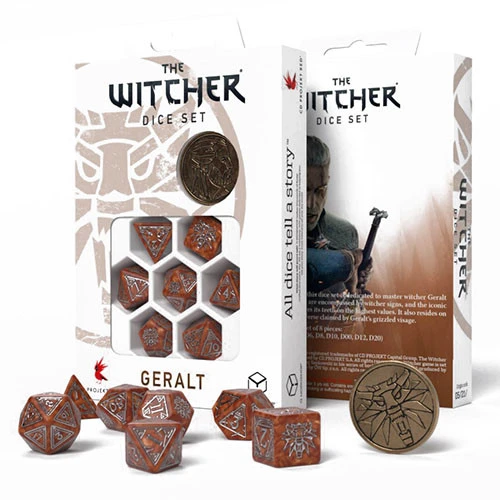 Inspired by The Witcher franchise, this dice set is dedicated to Geralt of Rivia a seasoned monster slayer. The set contains 8 pieces; 7 polyhedral dice, and a metal coin featuring Geralt’s depiction, which acts as a D2. Each die is painted caramel with silver engravings. The highest value faces and coin reverse display the Wolf School symbol.