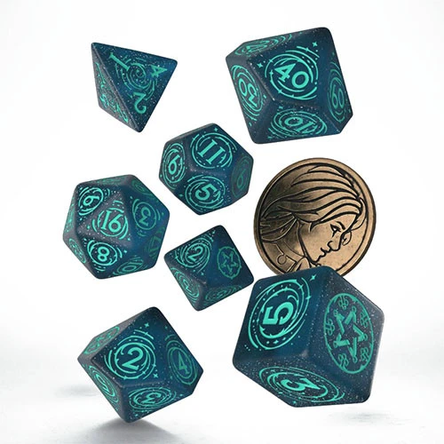 Inspired by The Witcher franchise, this dice set is dedicated to Yennefer of Vengerberg a powerful sorceress. The set contains 8 pieces; 7 polyhedral dice, and a metal coin featuring Yennefers depiction, which acts as a D2. Each die is painted in the image of a starry night sky with turquoise engravings. The highest value faces and coin reverse share imagery with Yens pendant.