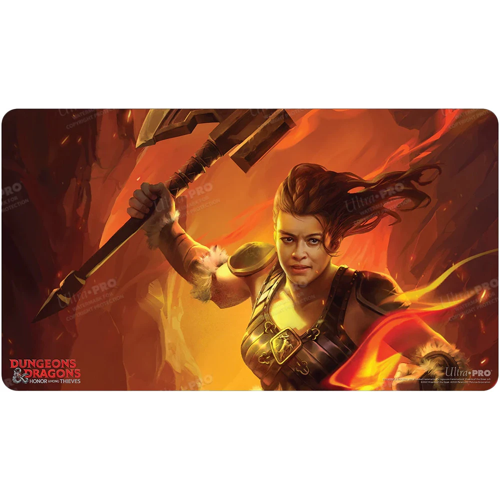 Playmat that features artwork from Dungeons & Dragons: Honor Among Thieves. Made with a soft fabric top to reduce damage to cards during play and a non-slip rubber backing to keep the playmat from shifting during use, playmats enhance the gameplay experience. With dimensions of approximately 24 in. x 13.5 in., a playmat also makes an excellent oversize mousepad for home or office.