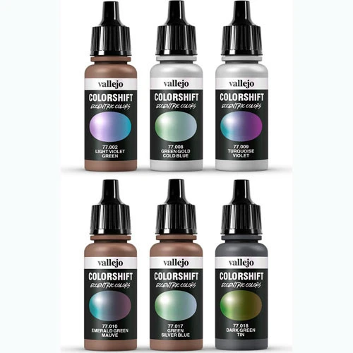 Colorshift is a selection of ready to use metallic acrylic airbrush colors. The multichromatic pigments used in the formulation of these colors give them a vibrant metallic sparkle, while their glass-like coating acts like a refracting prism. Each flake presents a variety of color depending on the angle of view and incident light; the color shift effect is observable with both high- and low-gloss applications and in a wide variety of lighting conditions and is intensified if the colors are applied on a curved surface, while best effects are obtained over a gloss black base color.