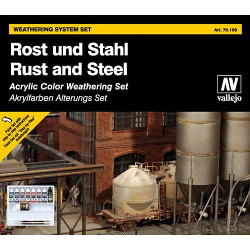 A boxed set containing 1 Pigment, 8 bottles of acrylic colors, 2 brushes for painting miniatures, a mixing palette, and a Model Color chart, with detailed step by step by Langmesser Modellwelt.